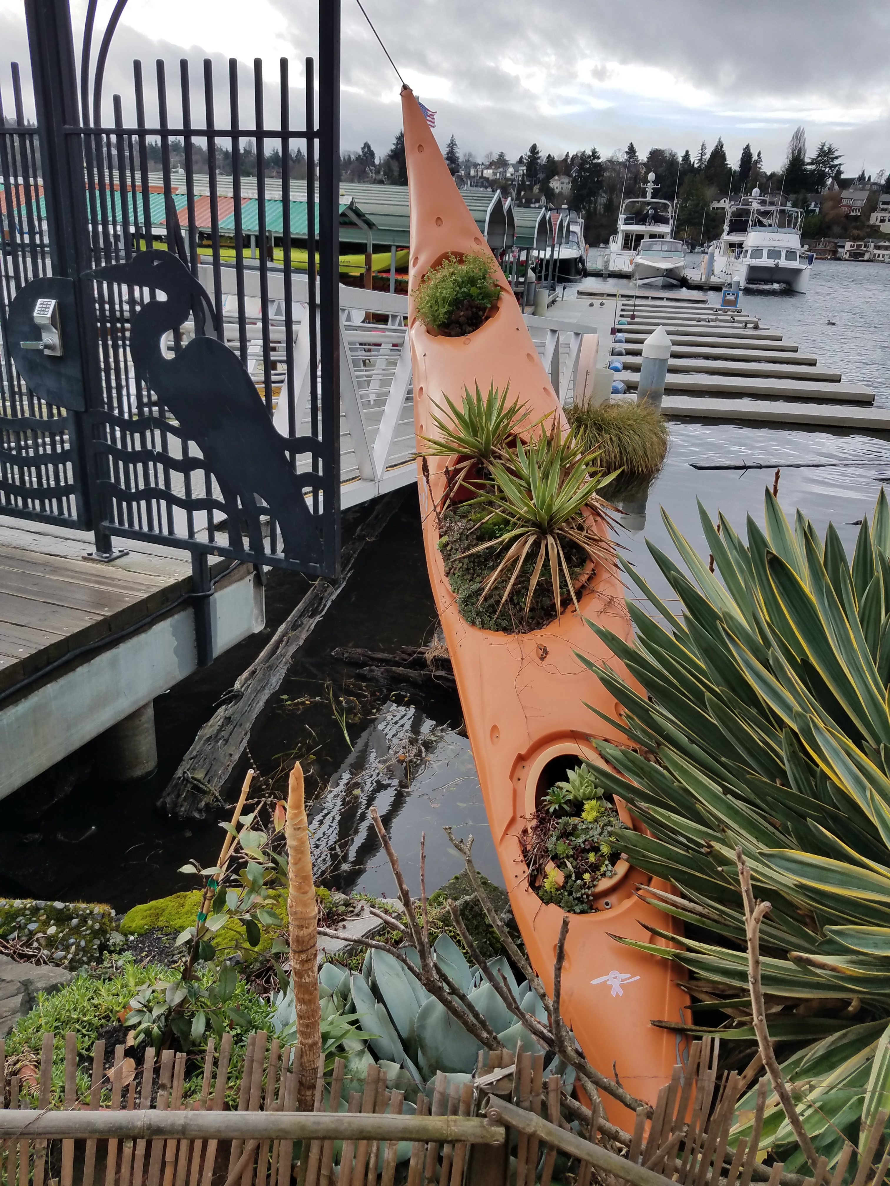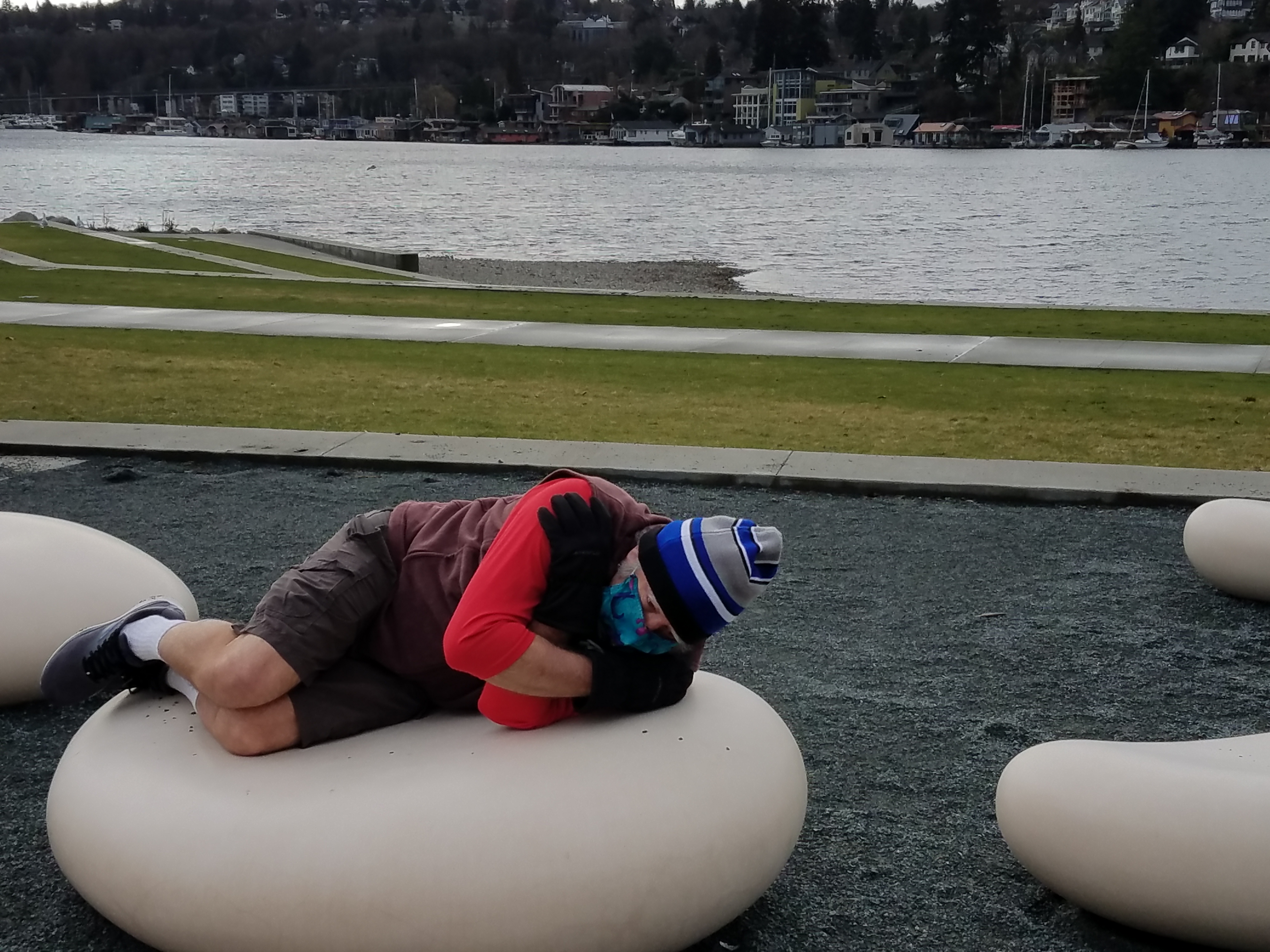 We headed south to the newish waterfront park on the waterway between the University and Montlake bridges. There were one or two others passing through, but we really only shared the blustery park with seagulls.