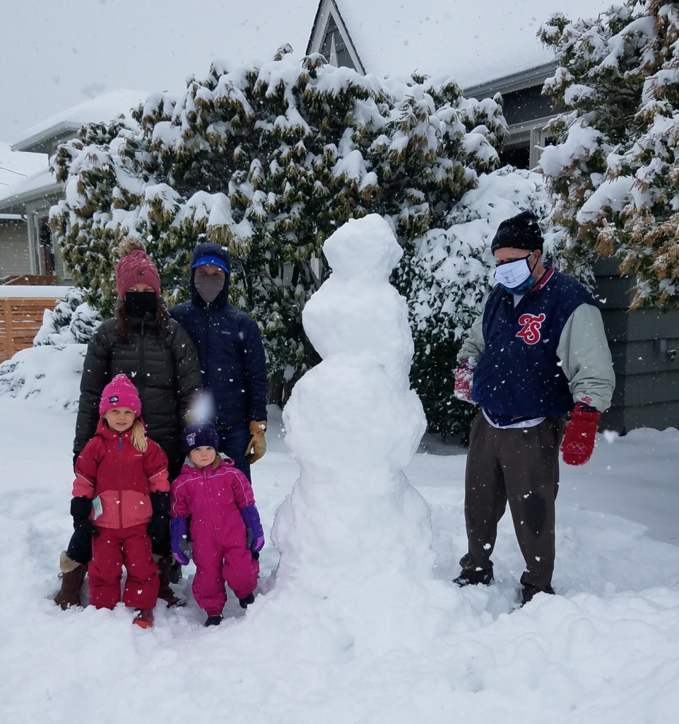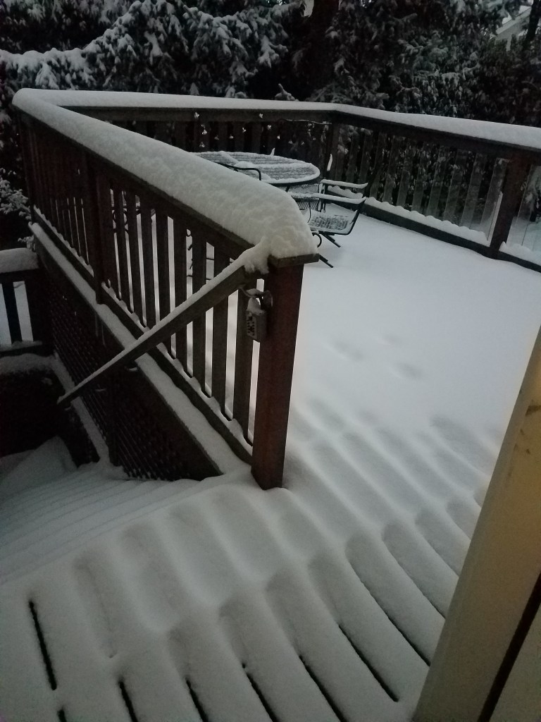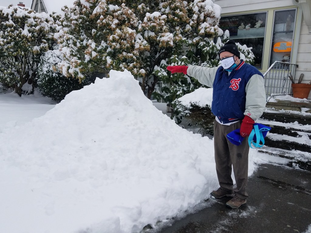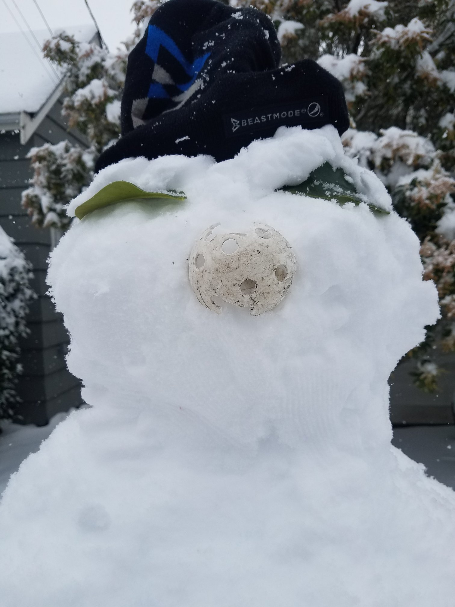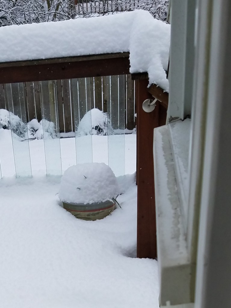 Carl shoveled. It was 6 inches, but light snow. Not good enough for snowmen, so a small mountain appeared instead.