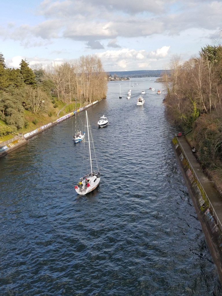 We were finishing the walk crossing the Montlake bridge when I paused to take a picture of all the boats in the cut. We were noting that the lead sailboat, closest to us, had just done a U-turn. I suddenly realized that was because the drawbridge wasn’t up yet, but would be soon. So we hightailed it off as the horn sounded the warning.
