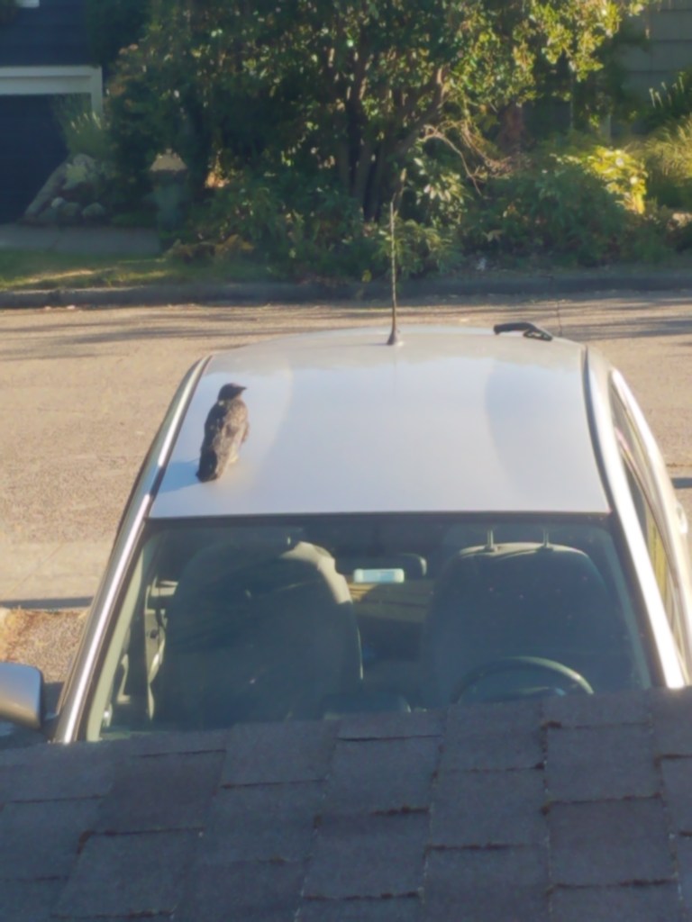 Baby spent time on top of garbage bins, in a small tree, and a lot of time on and around the street. And on the Prius.