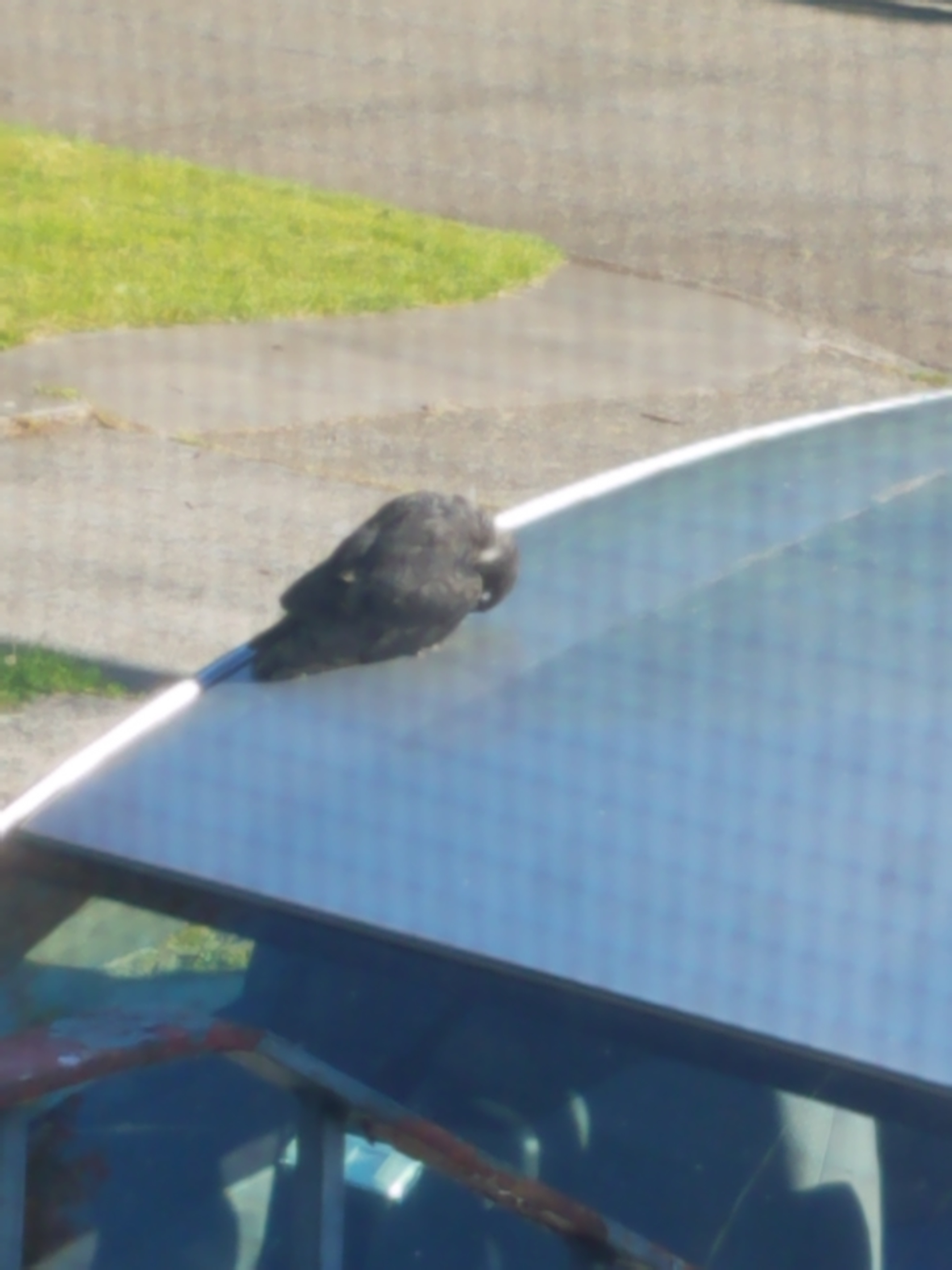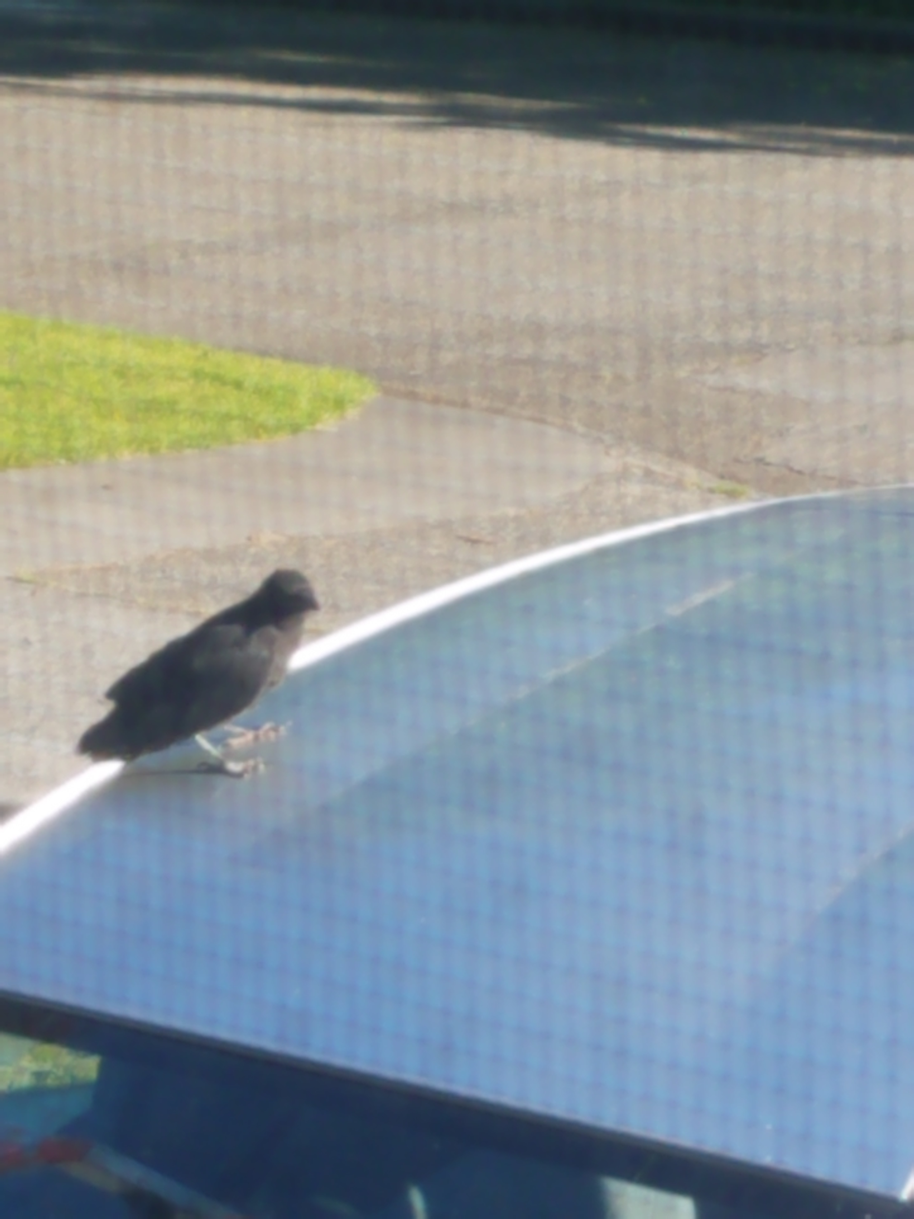 Carport roof to car. Carl saw baby slide a bit down the sloped car roof.