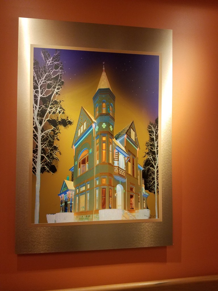 There’s a fair amount of art in the hallways, several like this of different houses. This one is along the route to Dad’s room. It reminded him and me of a house at 7th and Liberty. When I walked to elementary school it was my favorite house. It has a turret!