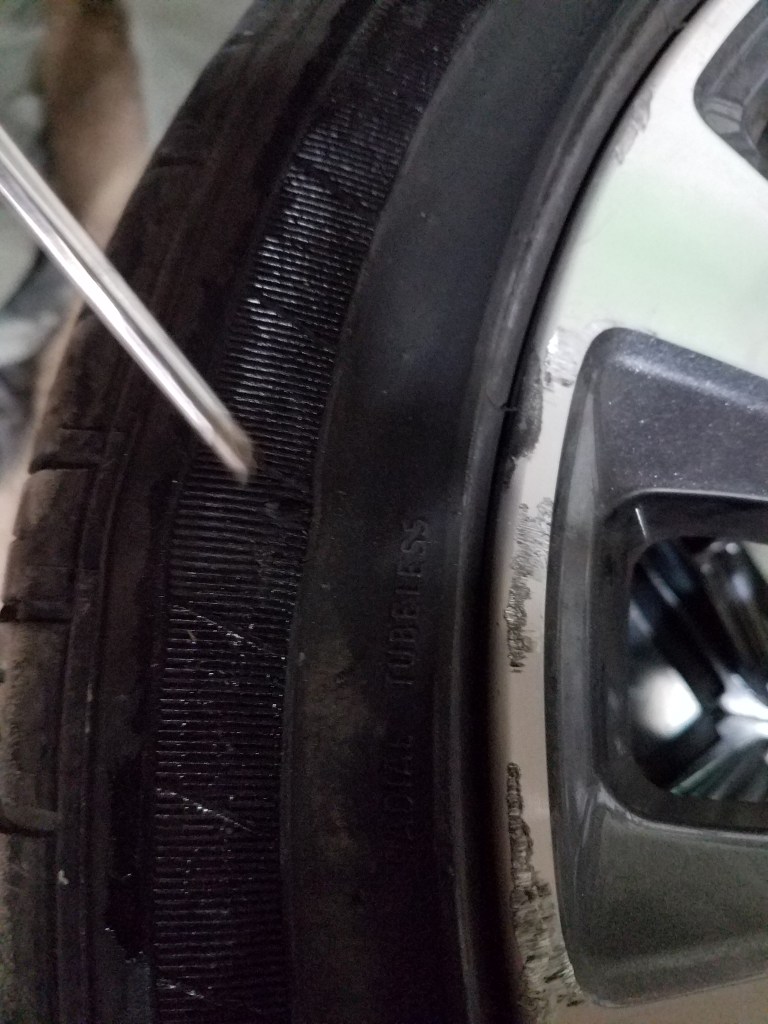 The actual duration ended up around 8-1/2 hours. The fun started when we entered Pennsylvania on I-81 South. The dashboard lit up with a low tire pressure warning, and while 3 tire’s had pressures in the 30s. The right front tire was at 23. Then 22, 21 and dropping. We exited into the Great Bend Welcome Center rest area, and set about trying to get a fix. It was about 7:30 PM, and dark. Checking the tire, they could hear air escaping from the side wall.