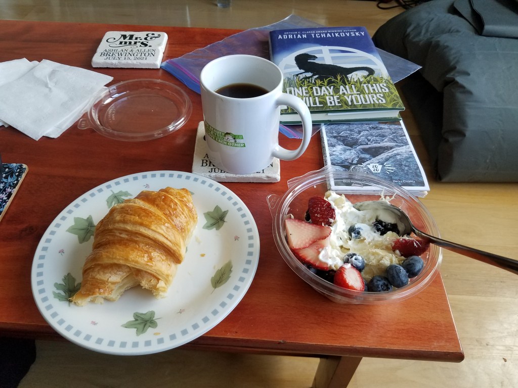 Leg something of the trip. Jane drove from Ann Arbor to Geneva. Too many hours, but no major issues. In a largish SUV. The vehicle size was required by the continued moving of Dad’s belongings from his old house to others. In this case to Ashlan and Allen. Two boxes, two paintings, a Schotz clock, and a poster tube. Jane’s condo has a few more clear square feet.