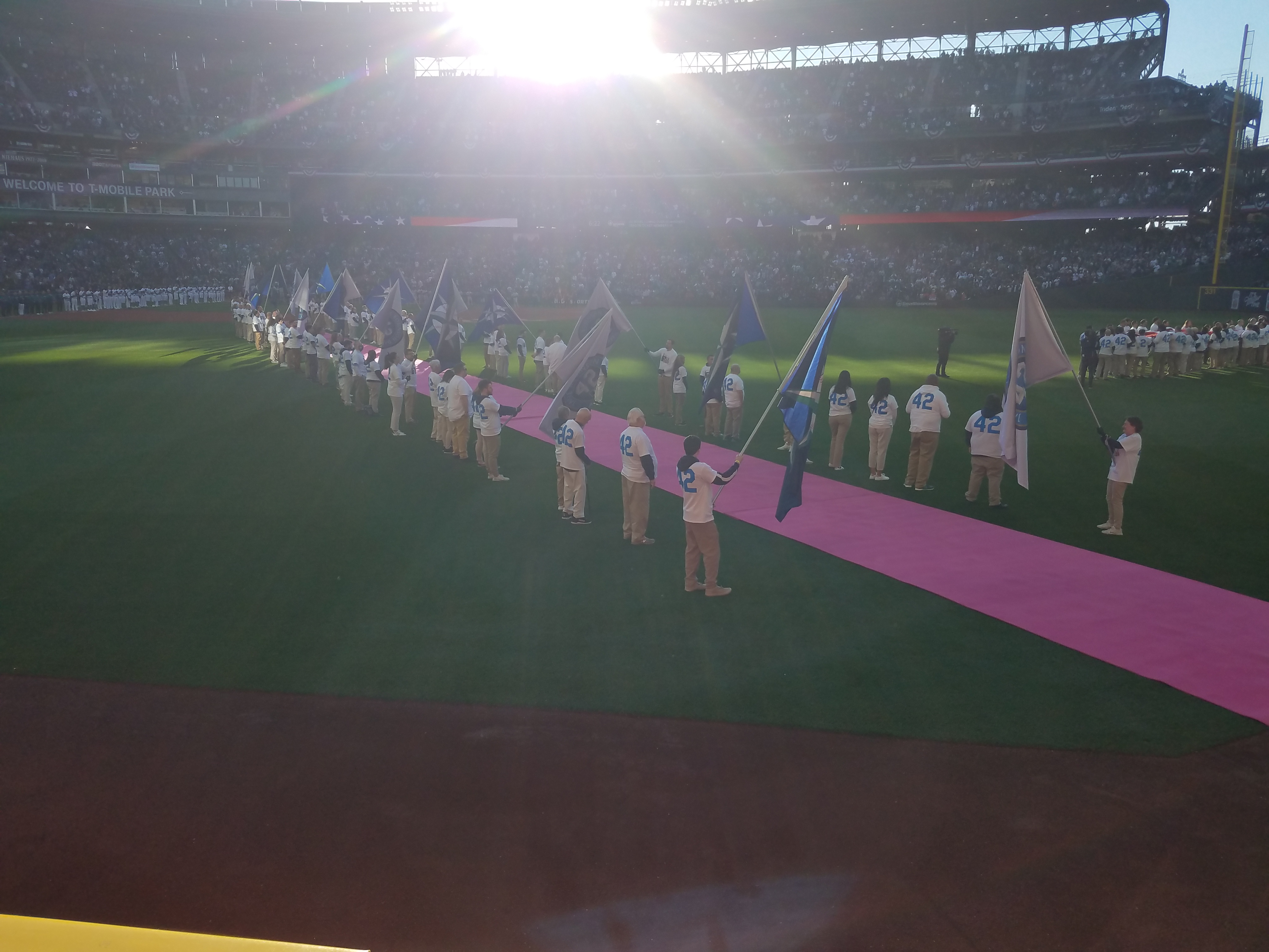 Dennis was up for the Mariners Home Opener. We walked to light rail and took the train to the stadium. I was probably a bit anxious about Dennis’s walking speed (he uses a cane), but I over padded my estimates of time and we were first in line.