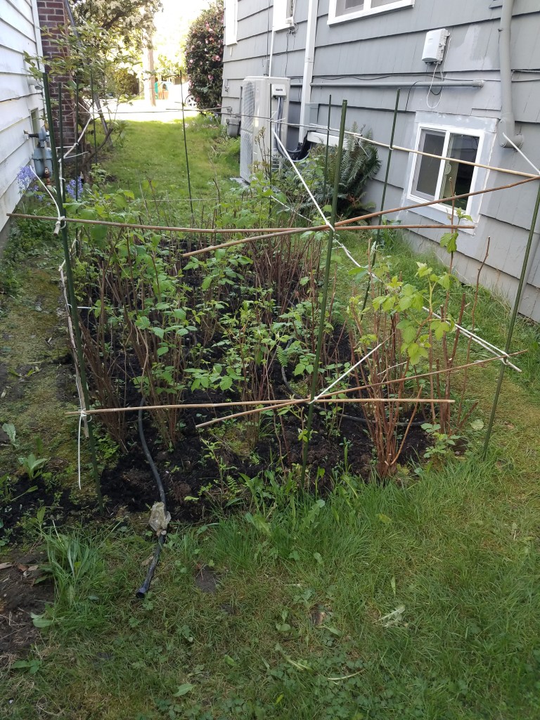 And there is a list of home projects that also need to get done, so while the sun was shining this afternoon we made hay. Or at least staked the raspberry patch and did some weeding. The raspberry patch staking is good enough to hold until I return. I needed a few more zip ties for my loosely held together structure.