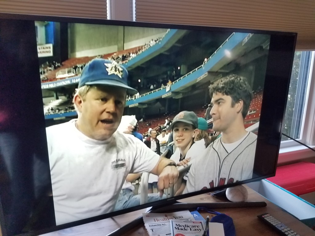 Late evening. Mingling and talking. And more film watching… inside. One of our guests, Mark Handley, filmed a lot of footage of friends at the Kingdome, at senior league games and elsewhere. He has recently loaded the raw footage onto an external hard drive. He brought it over and plugged his computer into our TV. Viewing our much younger selves was a hoot, and carried us well past midnight. We only stopped because none of us thought an all-nighter was a good idea. One of the parts we watched was the last baseball game in the Kingdome in 1999. One of the few pictures I took showed Carl and Rey, engaged in baseball talk during the pregame.