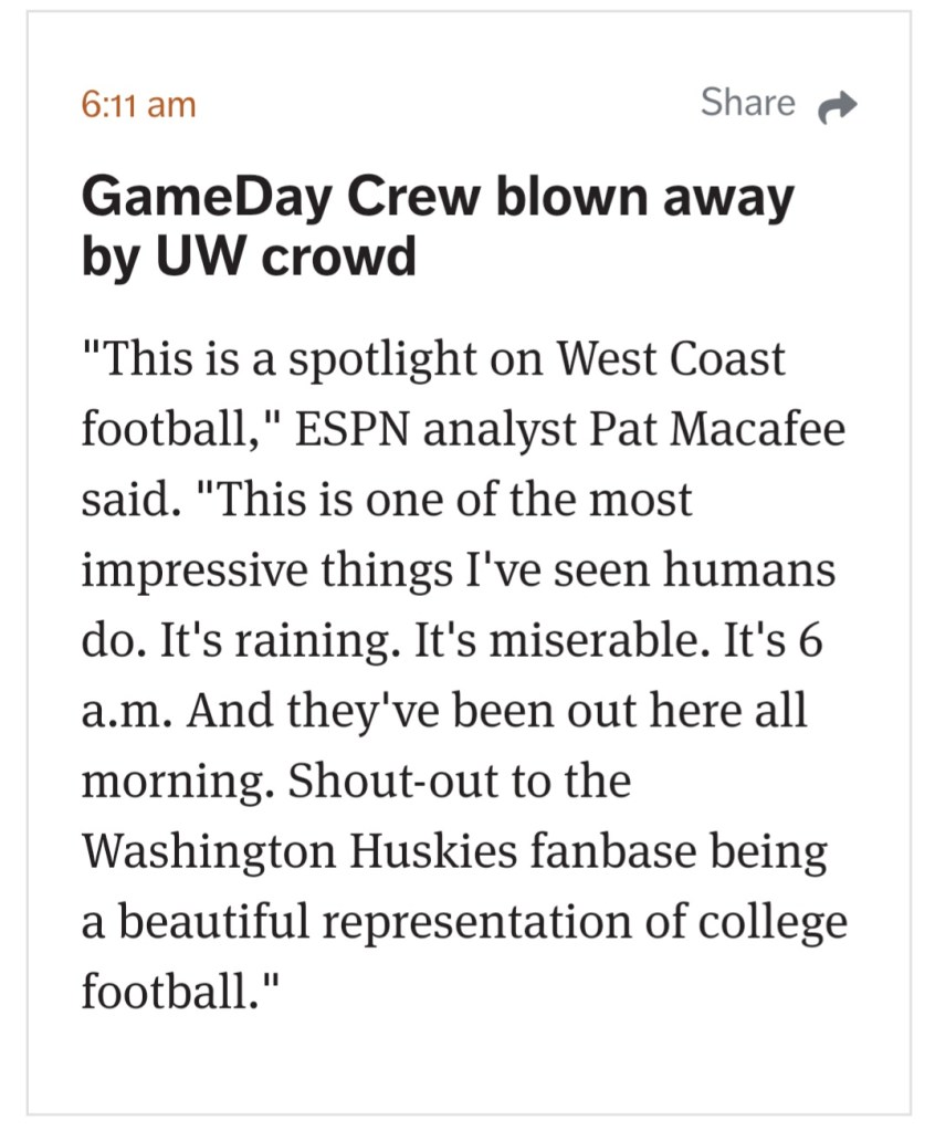 I wouldn’t know about GameDay except for their coming to UW a few years ago. 1) I don’t closely follow college football and 2) it is timed for east coast viewers, the left coast doesn’t count into their targeted viewership.