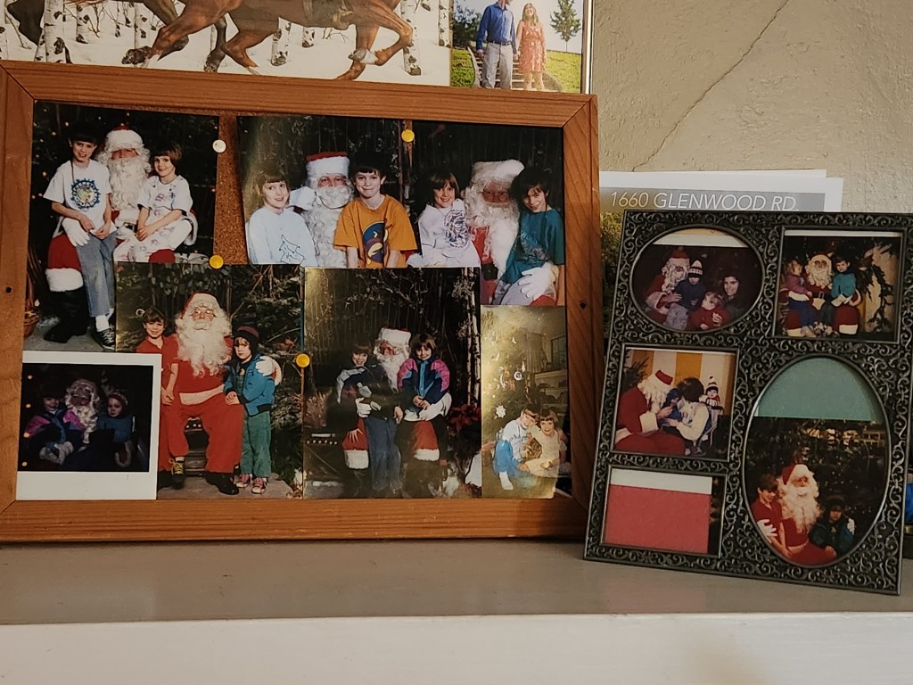 I am not a huge fan of mall Santas, which made stumbling across Santa in the Zoo magical. He was in a tent near the petting zoo, sitting on a folding chair, with an attendant and bag of small animals to hand out. The attendant had a Polaroid camera. No charge. If you zoom the picture and look to the right, that’s where the early photos are. In the first encounter, Ashlan is on my back, and Rey is just talking to Santa, not on his lap. Eventually Santa moved into the new Zoo Store, and it got glitzed up. Anytime the kids aren’t wearing jackets we were inside.