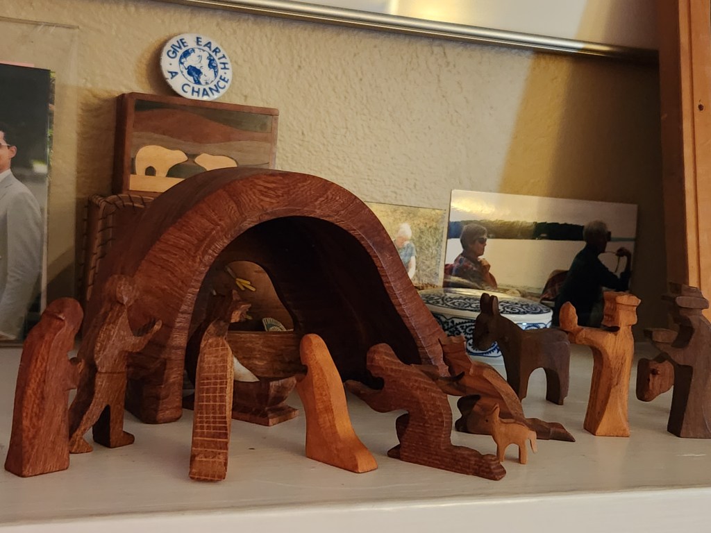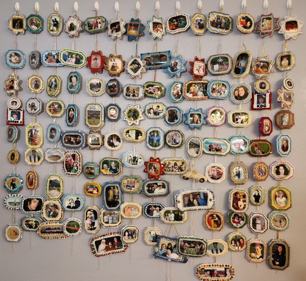 There is always the question of what to do with the picture ornaments. On the tree or elsewhere. Originally, they were on the tree. But our trees are usually not too large, and at this time we have about 125. They would not come close to fitting the tree. Hence the picture wall.