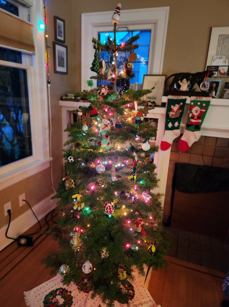 The original ornament wall was in front of the window. We installed it there multiple years. But it blocks the window, and working from home, I like to be able to see out. Last year we put some on the tree, just chose a few. This year, back to the wall idea, but in a different location.