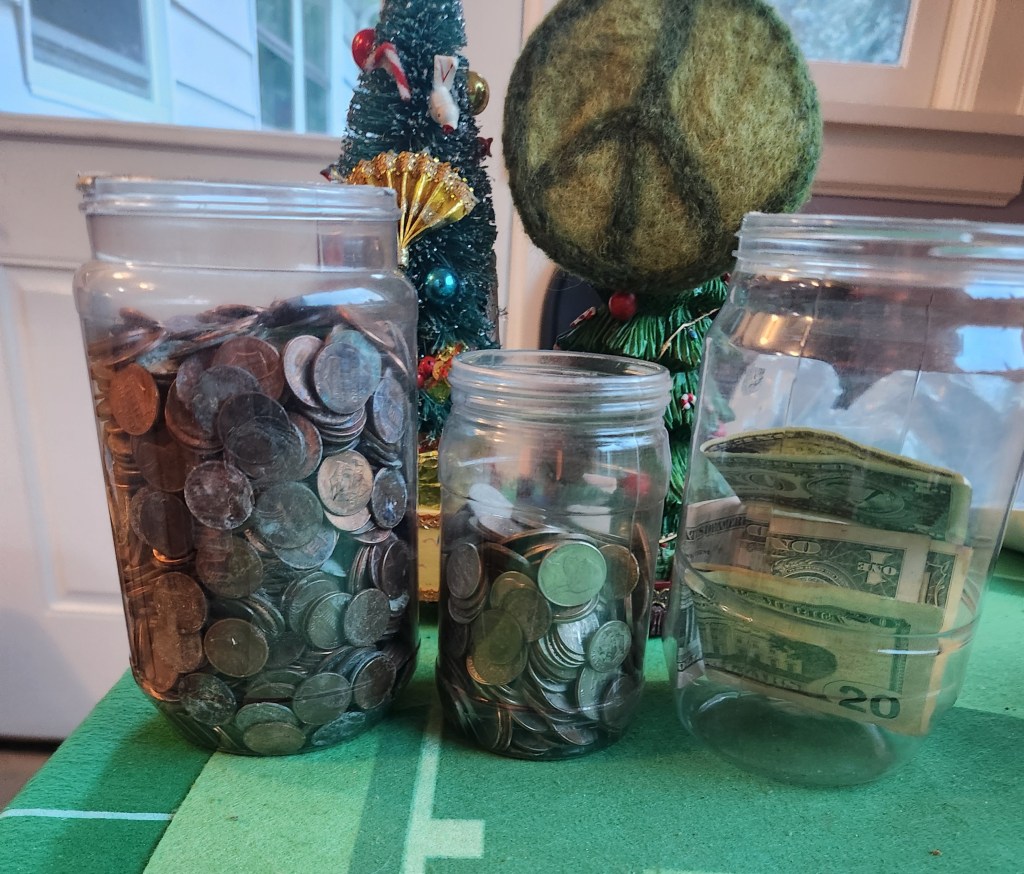 Our “work” today consisted of identifying the winner of our Found Filthy Lucre contest, the 2025 version. On walks Carl looks for money that has been lost, and is now found. At the end of the year the found funds are totaled and pictures taken. Then we invite the neighbors to guess the total, and the closest to the actual amount wins the money. This year we had 33 entrants, and the winner was only 29 cents from the total of $75.40. We will deliver their winnings tomorrow.