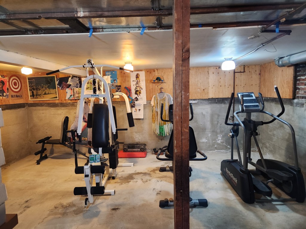 Wiped down all of the exercise equipment. The weight machine has been joined by a recumbent bicycle, elliptical, and a piece that can be used for sit-ups and other things. Most of this was cleaning accumulated dust. The equipment does get used pretty regularly, by Carl primarily.