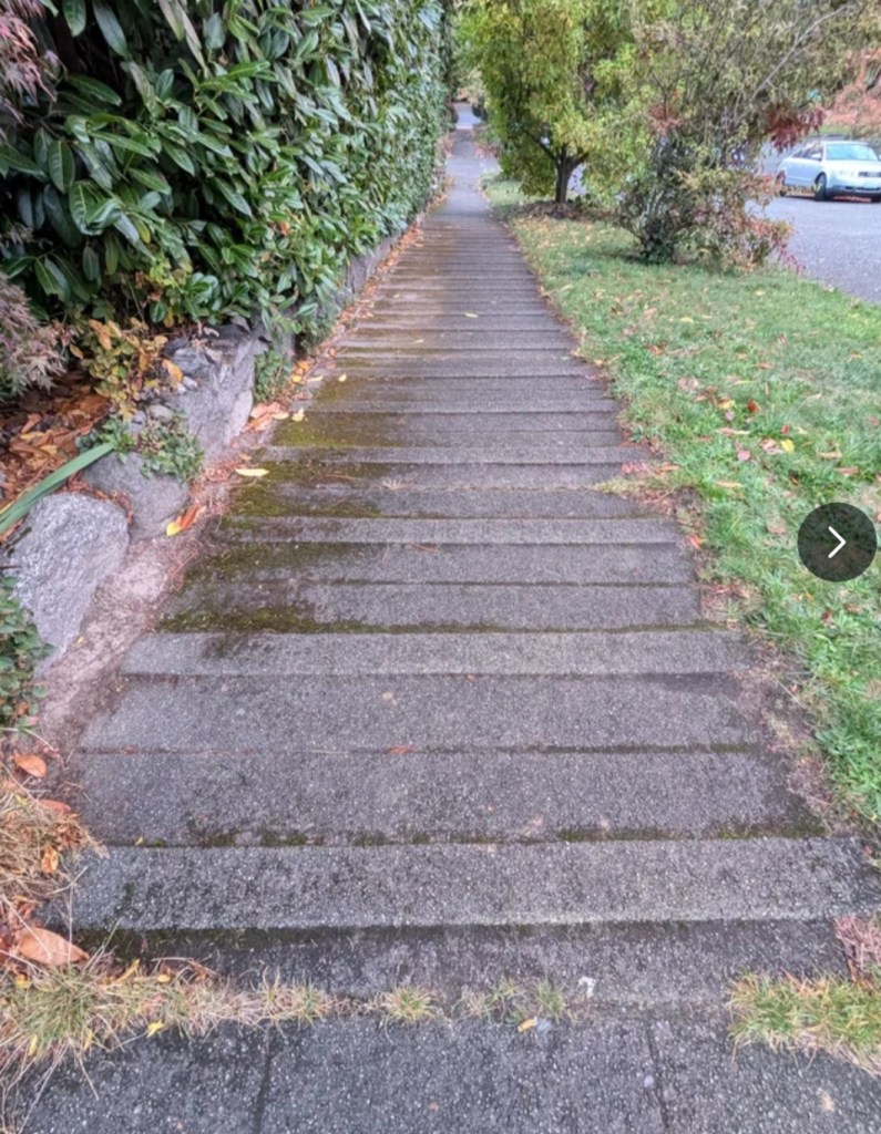 Today’s walk had a grocery store stop and breakfast for lunch. We went east on the way out and west on the way home. If you know Seattle that means going up and down over significant ridges. There were two peaks to summit each way. I don’t know the elevation gain/loss, but several roads were steep enough that there are ridges in the sidewalks.