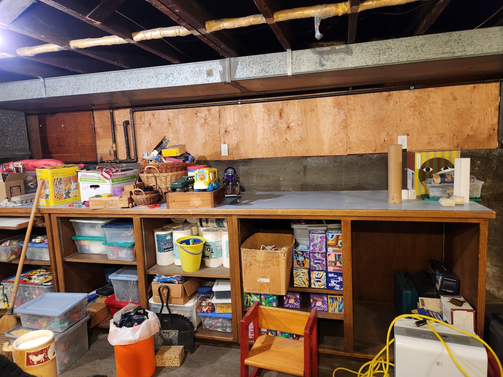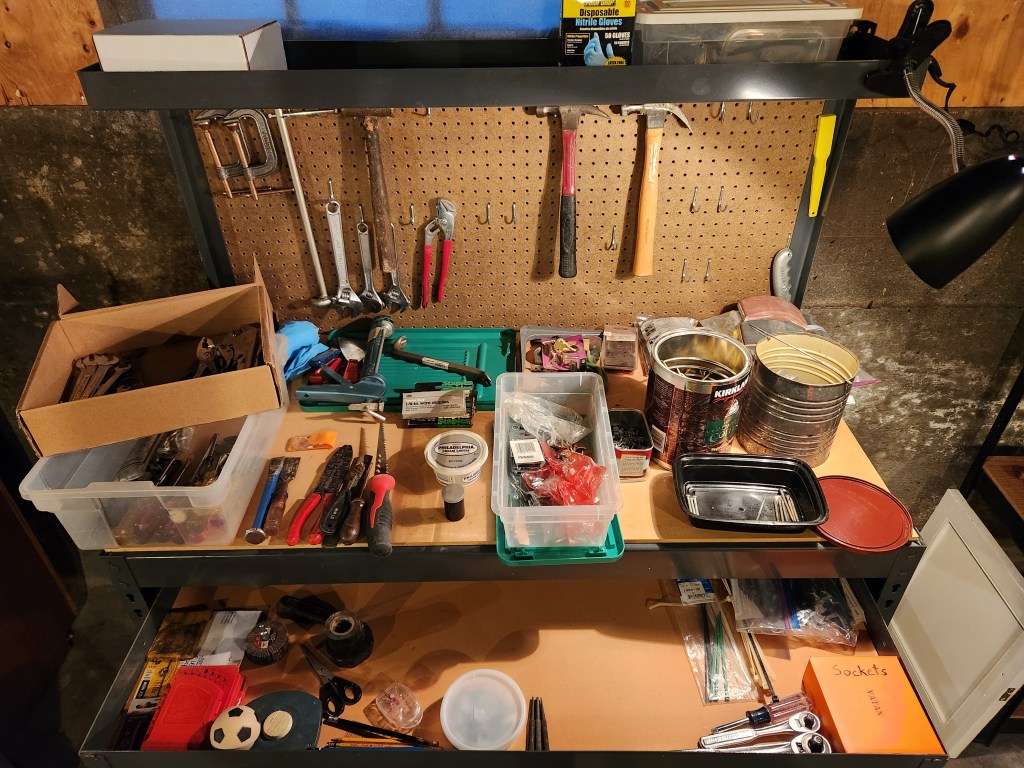 The left half of the shelves are primarily toys. (Except for paper towels and kleenex – Costco member) Tools have been cleared off the top, except one bin of small bits waiting decisions.