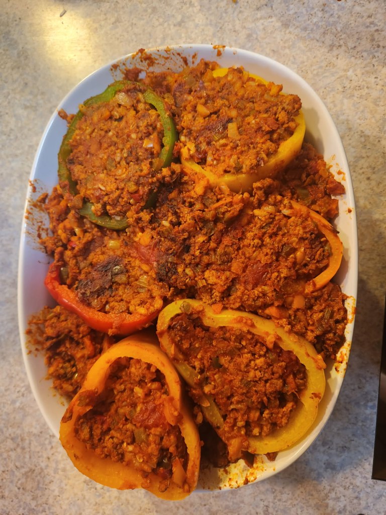Today’s cooking was for tomorrow’s big game. We’re hosting a few friends, and while that doesn’t always mean we provide the main course, this time we have stuffed peppers on the menu. And some garlic bread. We know a veggie tray will be joining and I assume some other food may show up as well. Should we get a bottle of bubbly? Or would that be a jinx.