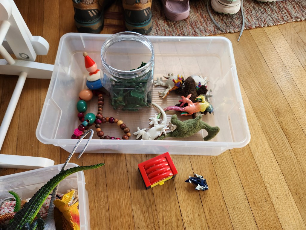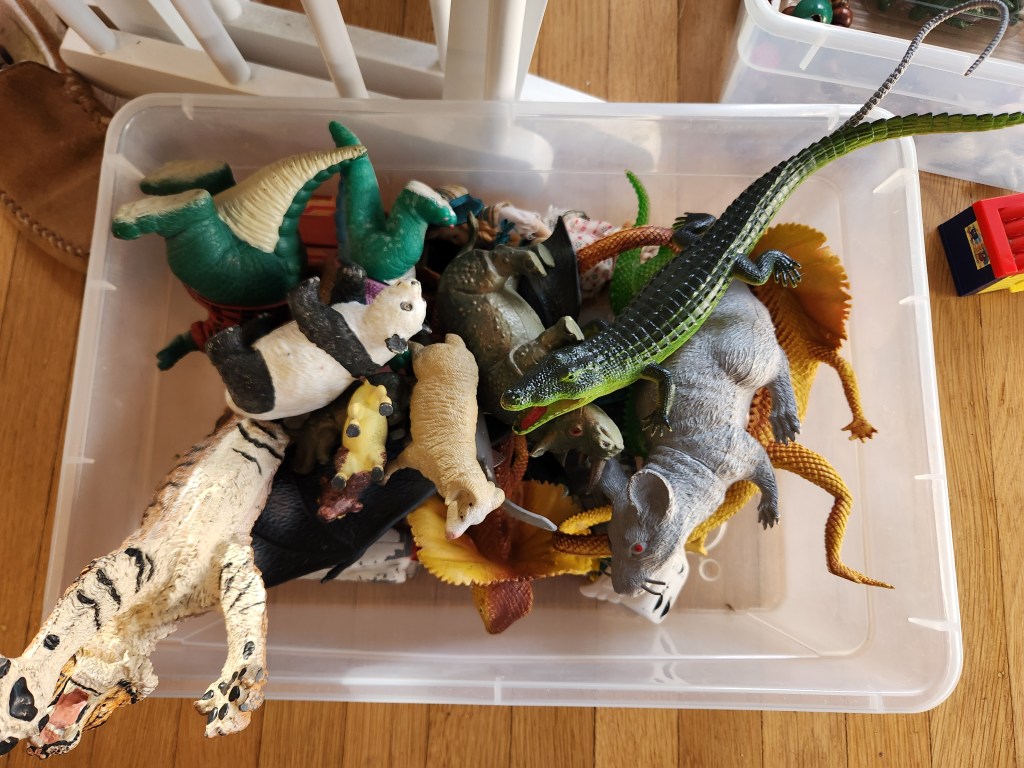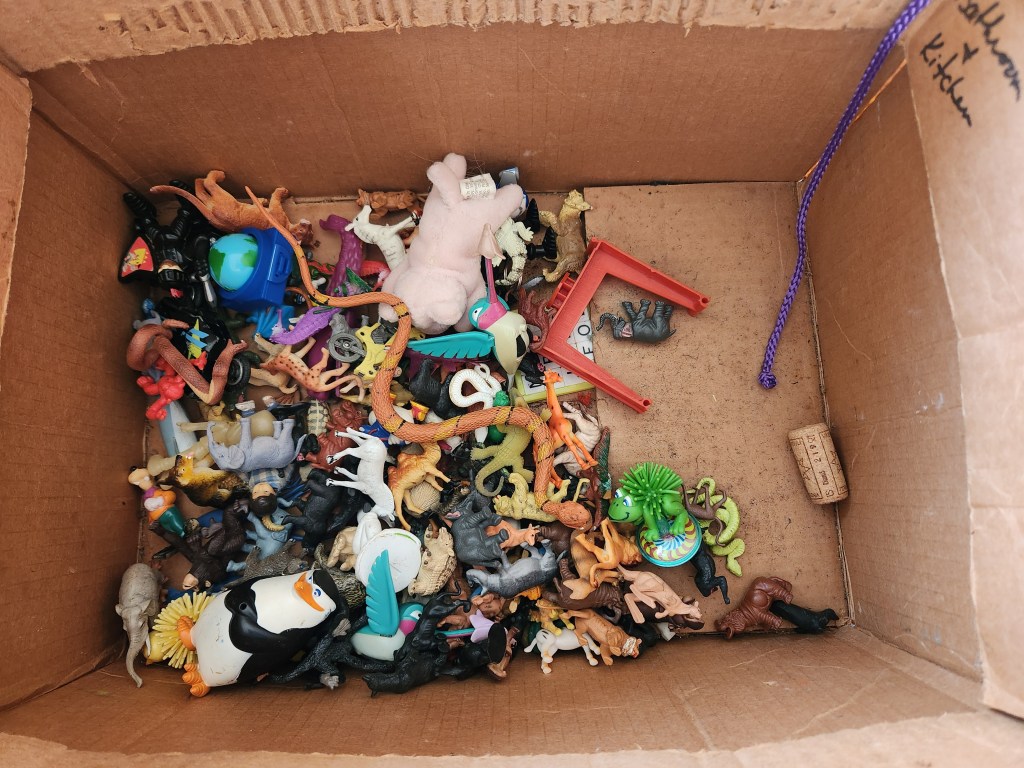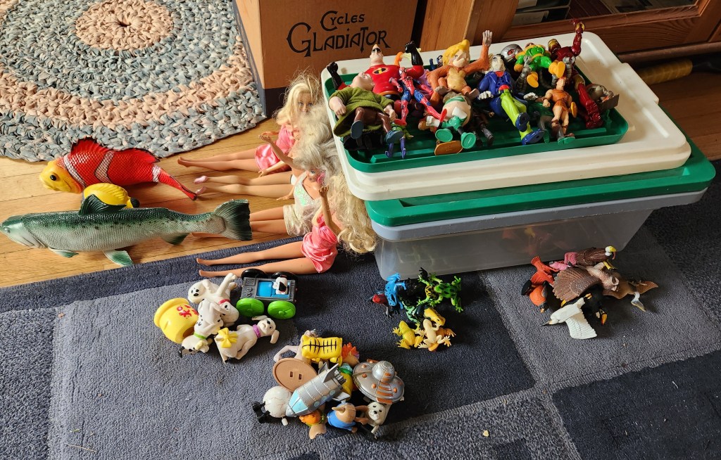 Just a few of the multitude of toys that will be leaving our collection. Two kids and over 30 years of providing daycare. These capture the sorting of 3 or 4 boxes of odds and ends. There are others already assigned and in the basement.