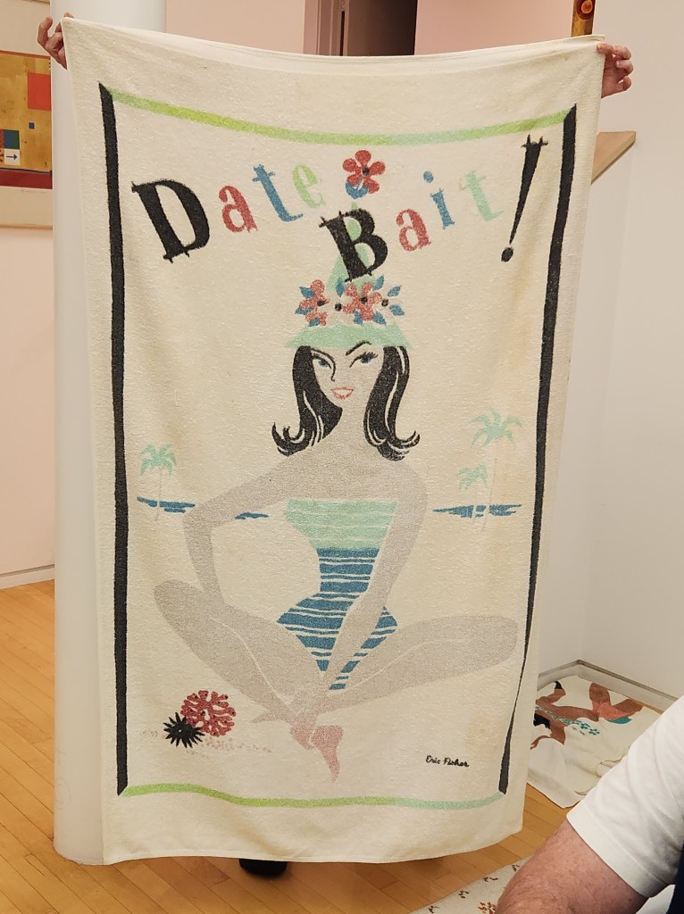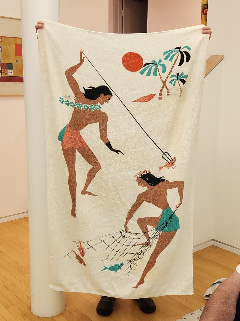 We have been hosted by my sister and brother-in-law at his parents house that is in the process of being sold as part of their estate. This means going through everything in the house. Not me, I have only participated marginally, but more on that another day. One of the treasures shared today were 2 beach towels, likely from the 60s. They have most recently been used to protect some of the fine art from the sun.