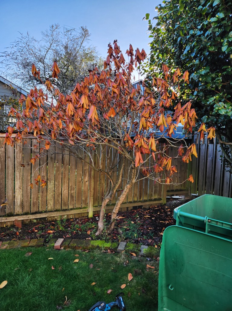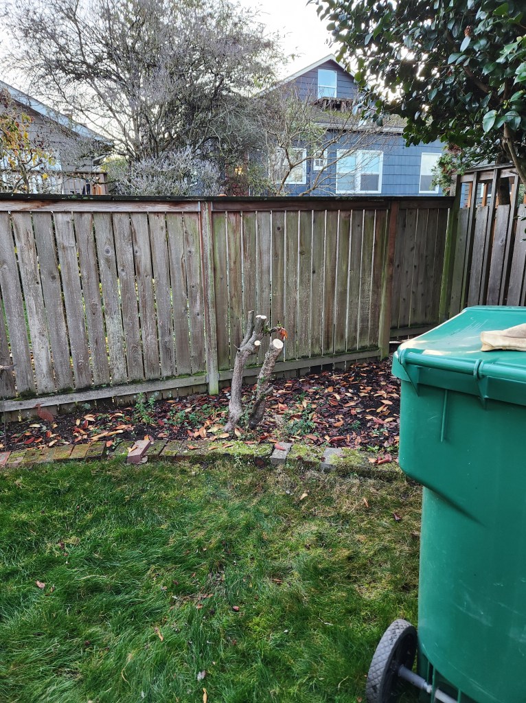 I was very surprised that the rhody died. It was well established and several years ago I had pruned it way back because it had gotten leggy due to an overbearing adjacent fatsia, that I also pruned back, and eventually removed. After that pruning it came back beautifully, so I thought it was bulletproof.
