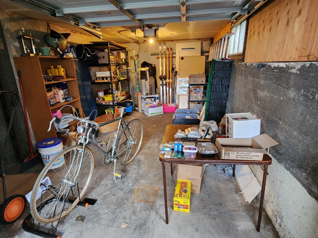 What’s going well so far: I invited 2 neighbors who happened by and a friend who stopped in for a preview. Several items have left the garage already! A globe, dating to the 1950s – think USSR, some 1/4″ hardware cloth, an under-bed storage container, assorted hardware, a partially full 5-gallon bucket of pea gravel, a lamp, and a box of 42-gallon contractor bags. No toys, but these were all adults.