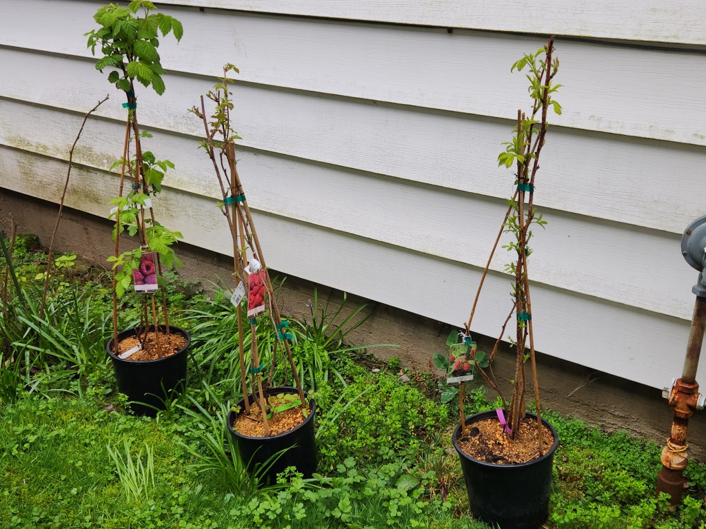 I had wrangled 1 cf bags of compost without too much difficulty a few days ago. So I was surprised the same size bag of soil was at the edge of my ability. It was also wet and slippery, adding to the silly walks carrying each bag. I was very apprehensive looking at the larger compost bag, but thankfully my dignity was restored. Carl managed moving the raspberry plants as they were within his weight restrictions. The bags were all a bit dirty, and now so are my pants and sweatshirt.