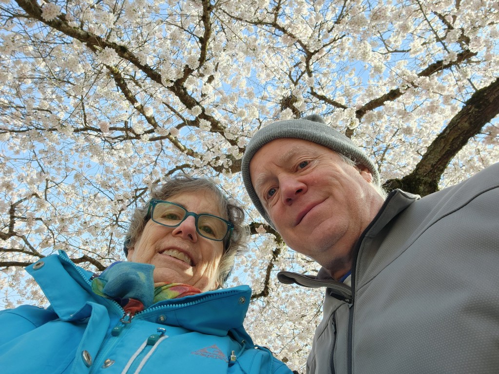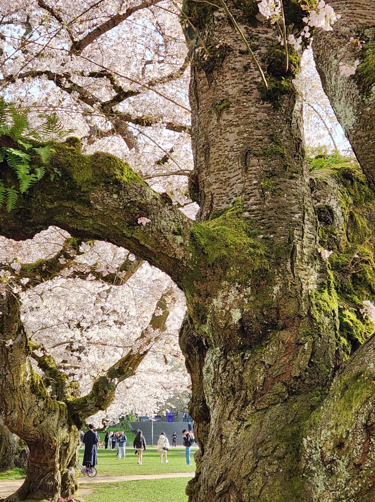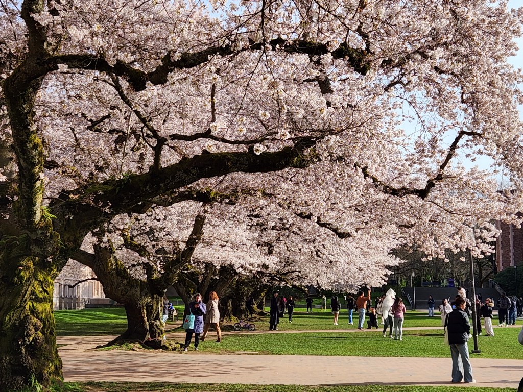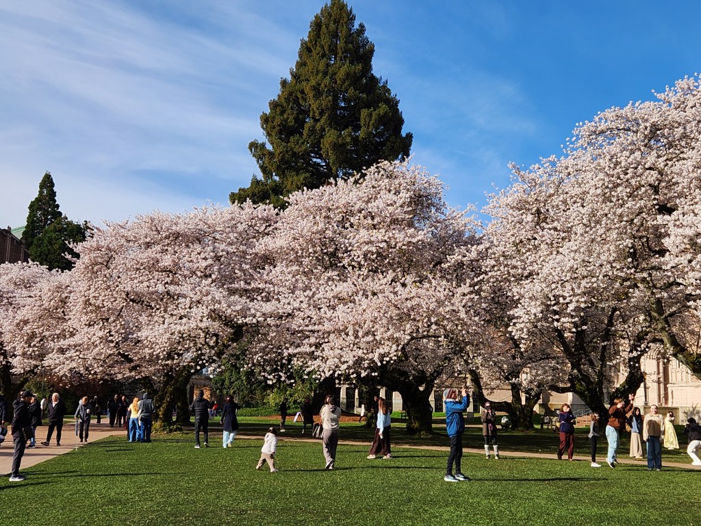 There are two main areas on campus with cherry trees. They are different varieties and bloom a few weeks apart.