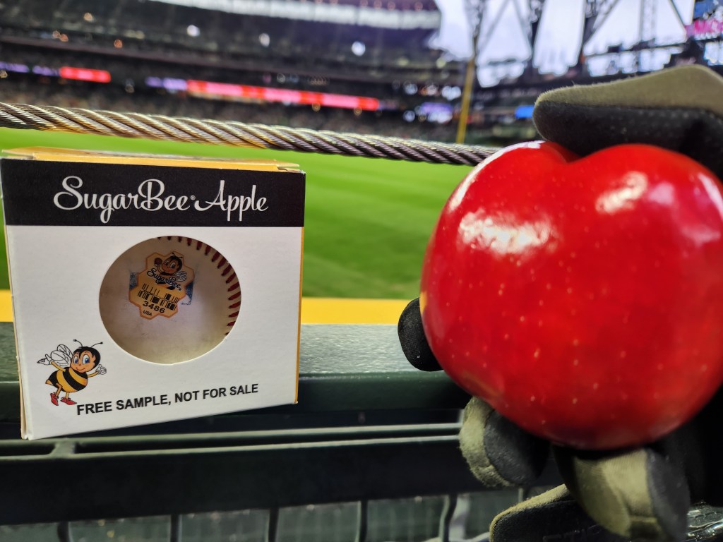 We got to the game a little early and decided to walk around inside the park. We headed up to the 3rd deck and walked around the concourse, mostly out of the rain. Near the kid’s play area they were handing out baseball sized boxes. Our first thought they were giving out whiffle balls to kids. But no, they were giving out apples, individually boxed. Sugar Bee apples to be specific.
