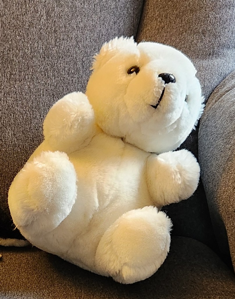 When we sent the beanie babies a few larger stuffies were also included. One of those, a Gund Polar bear has been adopted by Elijah, including becoming his first bedtime buddy.