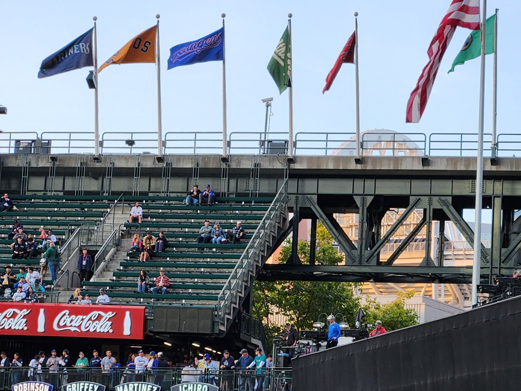 Carl giving away Majot League baseballs before the last game of the regular season Waiting for the gates to open for playoff baseball Crowd shotThe flags are in the order of the teams in the AL West. Mariners flag in the first place spot during the last game. With the hated Astros in 2nd.